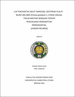 Periodontal disease is a progressive inflammatory condition affecting the supporting tissues of the teeth, caused by microbial infection, primarily due to biofilm accumulation. This disease has a high prevalence worldwide, including in Indonesia, which reached 74.1% in 2022. Conventional treatment through mechanical therapy and synthetic drugs often has limitations, including side effects and potential issues such as antibiotic resistance. Therefore, alternative treatments using herbal medicine, such as pomegranate peel extract (Punica granatum L.), have emerged as a safer option. Pomegranate contains active compounds such as flavonoids, tannins, and punicalagin, which demonstrate antioxidant, antibacterial, and anti-inflammatory activities. The use of herbal extracts formulated as nanogels for topical therapy of periodontal disease requires risk evaluation, one of which is through toxicity test. Acute toxicity test of pomegranate peel extract nanogel needs to be conducted to assess its potential toxic effects and ensure its safety for use. This study aims to evaluate the toxicity caused by pomegranate peel extract nanogel (Punica granatum L.) as an adjunctive therapy for periodontal treatment on Wistar rats. This is an experimental laboratory study with a posttest control group design. The research sample consists of 30 female Wistar rats divided into control groups (Na-CMC 0.5%) and treatment groups (5 mg/kg BW, 50 mg/kg BW, 300 mg/kg BW, and 2000 mg/kg BW. The parameters in the acute toxicity test include LD50, observation of toxic symptoms, mortality, body weight of the animals, kidney weight, macroscopic examination of the kidney, creatinine test, and histopathology of the kidneys in rats. The results showed no significant differences (p > 0.05) between the control and treatment groups in terms of body weight, relative kidney weight, and creatinine levels. Histopathological analysis also showed no signs of kidney damage at the low dose, but there was inflamation at the dose of 200 mg/kg body weight. The conclusion of this study is that the gradual administration of the pomegranate peel extract nanogel only caused mild toxic effects and is still considered safe.